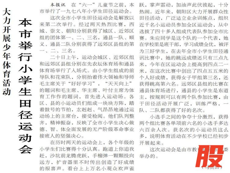 1978年5月举办的全市小学生田径运动会,成为北京校园体育复苏的标志性赛事,共有600余人次跻身各单项比赛前六名。赛场上,朝阳区“三好”学生朱应的进步格外亮眼:她1977年的跳远成绩仅3.9米,经过一年系统训练,在本届赛事中跳出4.55米,夺得女子甲组跳远第三名,同时位列跳高比赛第六名。(1978年5月24日《北京日报》2版,《本市举行小学生田径运动会》)
