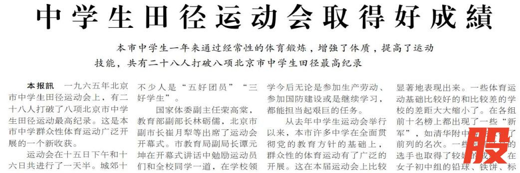 1965年,在北京市中学生田径运动会上,共有28名运动员打破8项市中学生纪录,他们将“准备劳动与卫国”的誓言化作了赛场荣光。(1965年5月17日《北京日报》2版,《中学生田径运动会取得好成绩》)