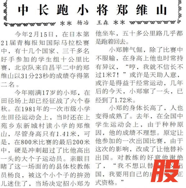 这一政策让校园运动会的意义不再只是课余文体活动,更是激励学生全面发展的加分项。从市小学生田径运动会上脱颖而出的郑维山,经过6年刻苦训练,从昌平二中的校级赛场一路跑进了国际赛场,在1987年举办的国际马拉松赛上获得学生组亚军。(1987年3月13日《北京日报》4版,《中长跑小将郑维山》)