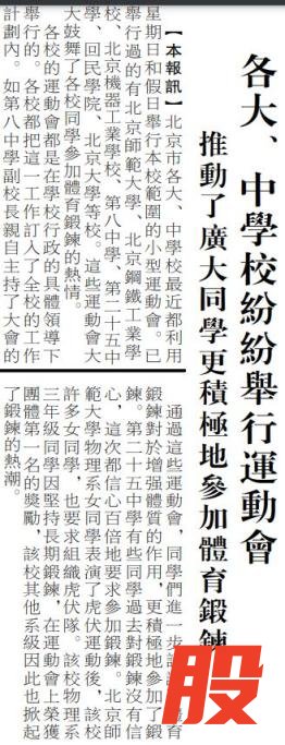 1953年春天,北京市第八中学、第二十五中学、回民学院等纷纷利用星期日和假日举办本校范围内的小型运动会,比赛项目以最常见的田径为主,选手则从班级预赛中产生。为兼顾不同体质的学生,第八中学要求长跑选手先做体格检查;没有专业裁判团队,第二十五中学的教职员便主动请缨担任裁判或记录员。(1953年5月6日《北京日报》2版,《各大、中学校纷纷举行运动会》)
