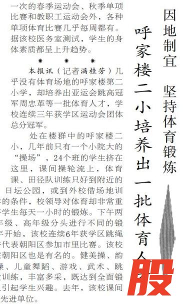 被密集楼群环绕的呼家楼第二小学,活动场地十分有限,全校24个班的课间操只能轮流做,体育课和田径队训练要辗转到附近的团结湖公园、日坛公园,或是向外校借场地才能开展。尽管条件艰苦,学校仍然使出浑身解数打造了健美操、韵律操、徒手操、儿童舞蹈、武术、跳绳等特色锻炼项目,既保证学生得到全面锻炼,又充分调动他们的兴趣。师生们用因地制宜的智慧证明了“只要想动,哪里都是运动场”。(1991年3月27日《北京日报》2版,《呼家楼二小培养出一批体育人才》)