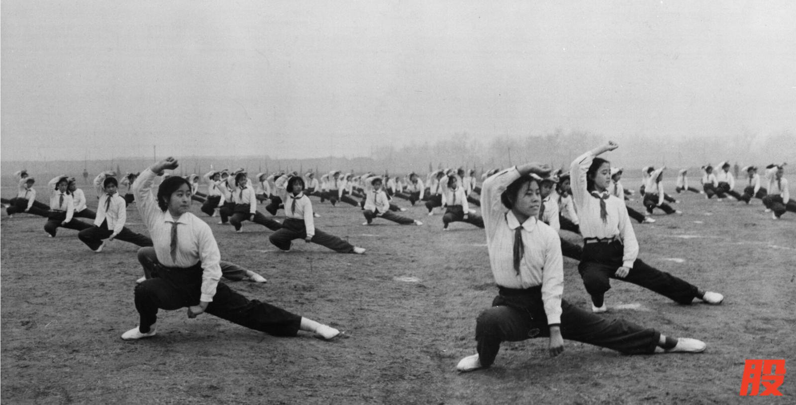 1964年4月,北京市第一零九中学的学生在第一届春季运动会上表演武术操。冯文冈摄