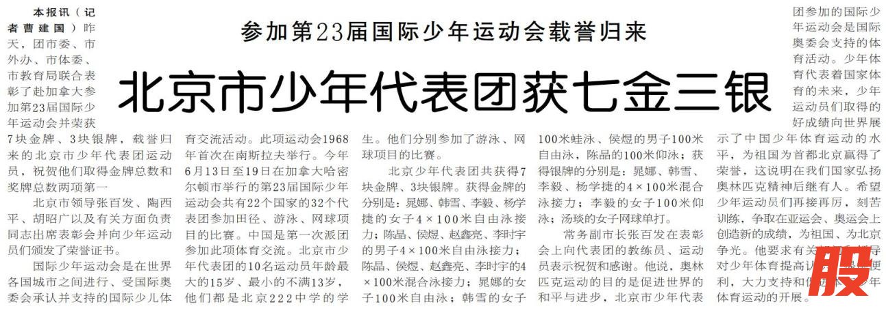 趣味运动不耽误人才选拔,竞技赛场上北京少年照样星光闪耀。1994年,10位北京少年组成代表团首次参加第23届国际少年运动会,在游泳、网球项目中一举斩获7金3银,取得金牌总数和奖牌总数第一的佳绩。这些来自北京222中学的孩子,年龄最大的15岁,最小的不满13岁,他们让国际赛场看到了中国少年的体育潜力。(1994年7月5日《北京日报》1版,《北京市少年代表团获七金三银》)